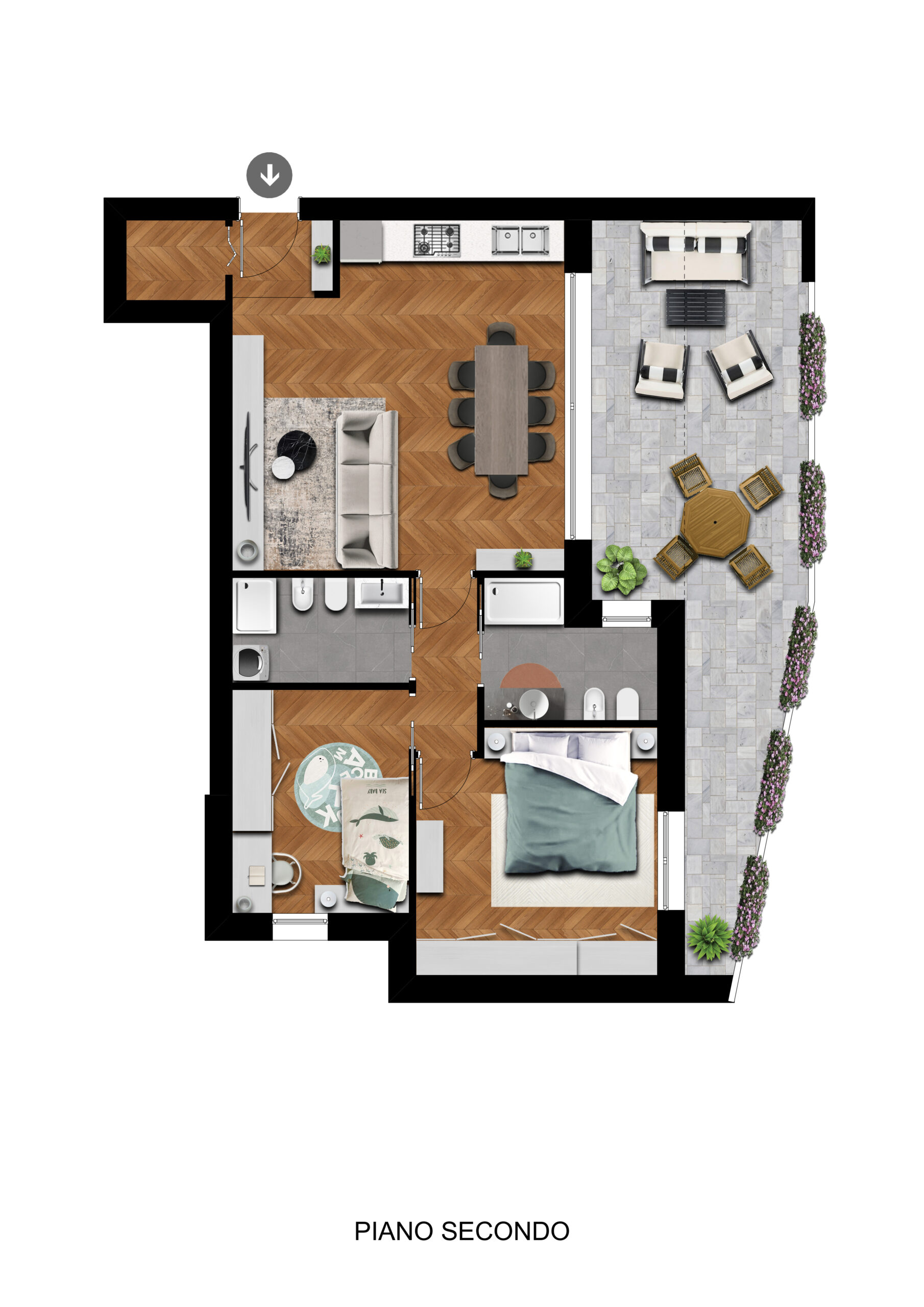 Consegna prevista primavera-estate 2027Appartamento al secondo ed ultimo piano: ingresso su ampia zona giorno open-space, grande terrazza abitabile di 30 mq, ripostiglio, disimpegno, due camere, 2 bagni e garage abbinato al piano interrato manovra comoda.